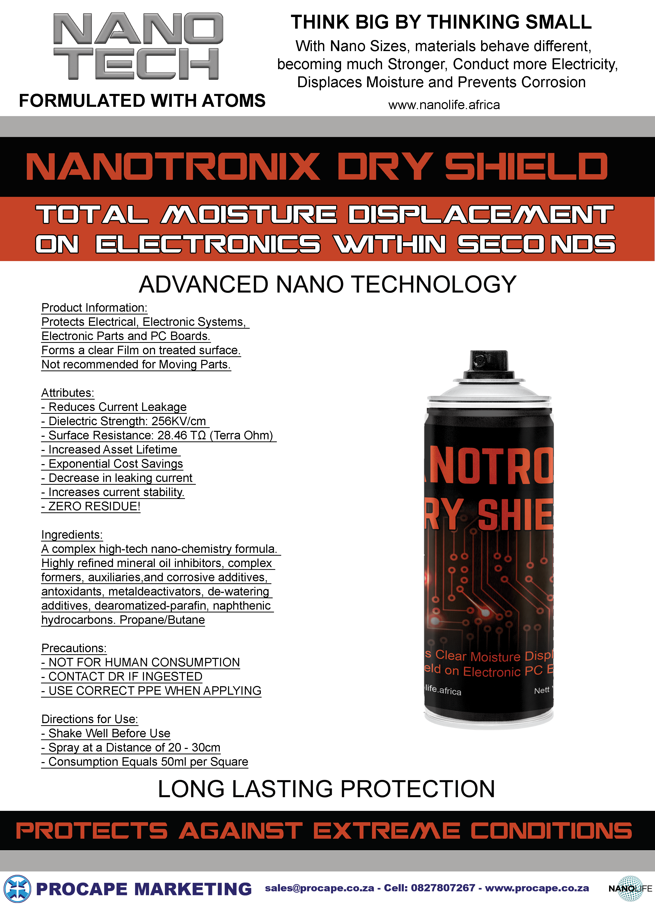 Nanotronix Moisture Displacement Dry Shield is a cutting-edge solution designed to protect non-moving parts from corrosion and damage. This advanced formula instantly displaces 100% of moisture in seconds, creating a dry shield that safeguards surfaces and ensures long-lasting performance. Ideal for various applications, Nanotronix Dry Shield provides reliable protection, preventing moisture-related issues and extending the lifespan of equipment and components.